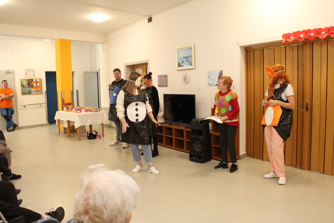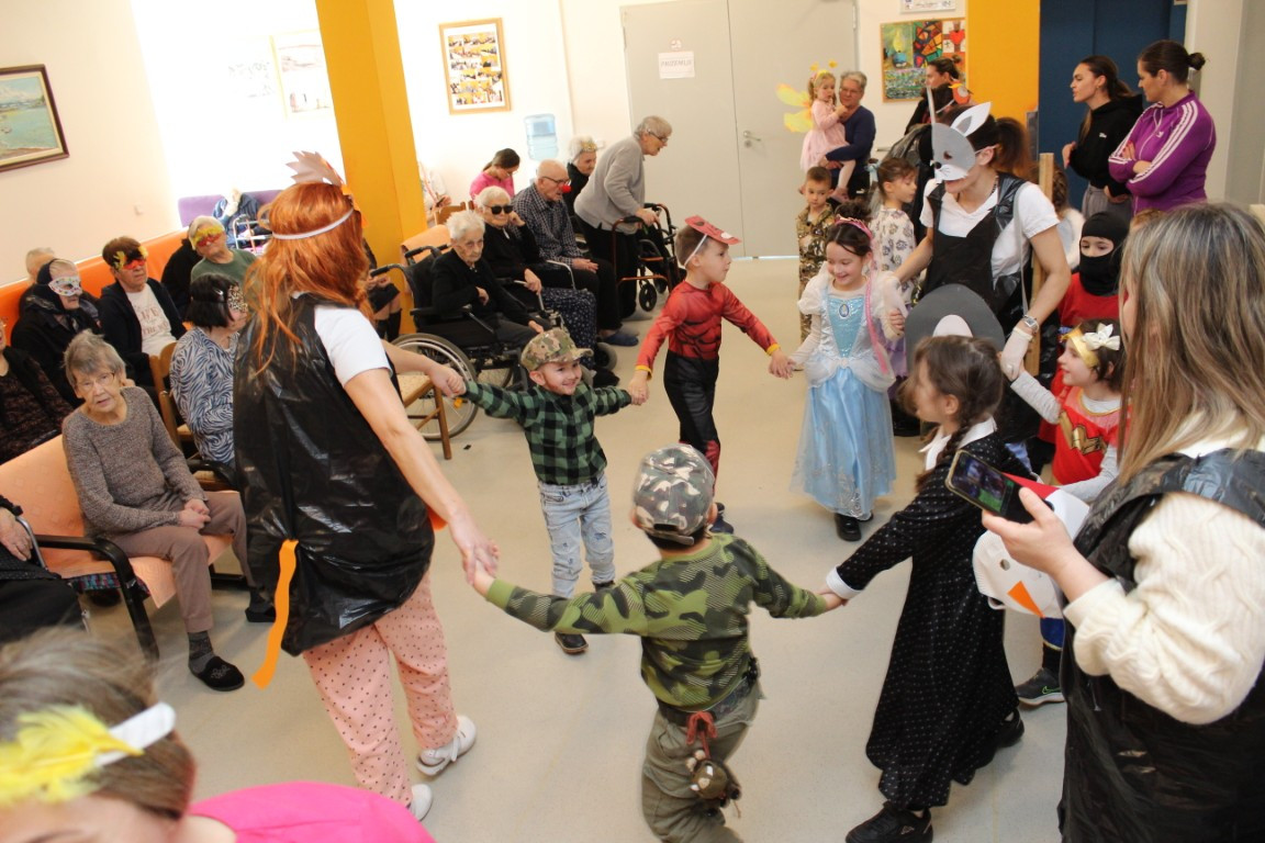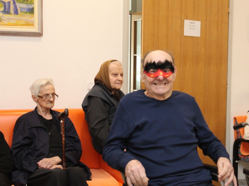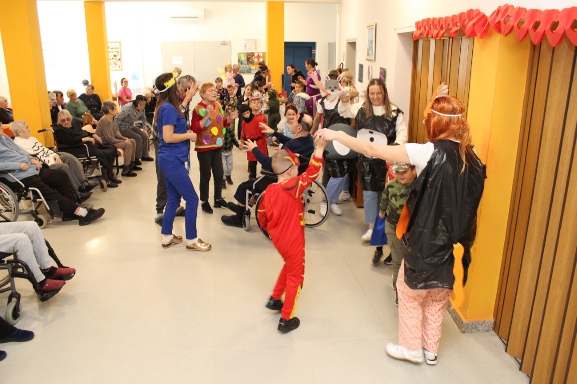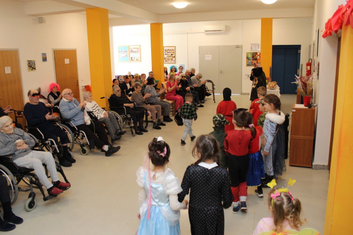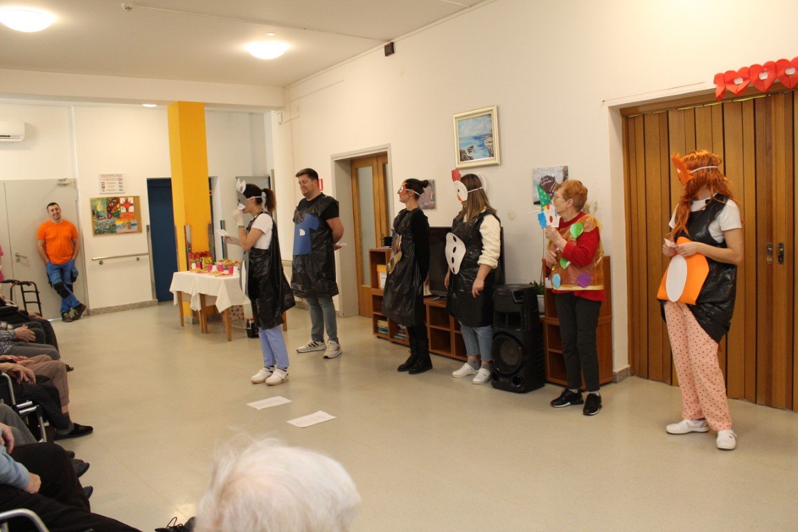 U Domu smo upriličili zabavni program povodom maškara, a u posjet su nam stigla i djeca iz Dječjeg vrtića „Koštelice“. Uz mnogo pjesme, smijeha i veselja zajedno smo se zabavili raznim izvedbama i igrama te počastili fritulama i kroštulama koje su pripremile vrijedne ruke djelatnika kuhinje Doma. Djeca su nam izvela nekoliko plesnih točaka te razgalila srca naših korisnika koji su veselo pljeskali u ritmu dječjih pjesama, a neki su i zaplesali. Nakon nastupa djece red je došao na djelatnike i korisnike Doma. Za djecu smo pripremili igrokaz u stihu Gustava Krkleca „Maskenbalske šale“. Nasmijali smo i mlade i stare, a gospođa Tona nas je sve oduševila svojim glumačkim umijećem. Nakon izvedbi uslijedile su zagonetke za djecu koje su ona s lakoćom pogađala. Pred sam kraj druženja ispunjavali smo glazbene želje. Svi smo bili na nogama, raspjevani i rasplesani, a oni najhrabriji uzeli su mikrofon i zapjevali. Rastali smo se u odličnoj atmosferi, djeca su obećala da će nas opet posjetiti, a korisnici i djelatnici su se složili da bismo češće trebali organizirati ovakva druženja. Lijepo je na trenutke zaboraviti brige koje nas more i zajedno zapjevati i zaplesati. Slika govori više od riječi pa u našoj galeriji fotografija pogledajte i sami se uvjerite kako nam je bilo.